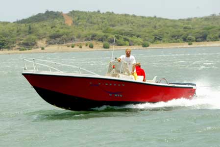 This is the 'Explorador' our PRO 42 Custom dive boat. It is powered by two 300 horsepower jetstreams. The boat is fully equiped for its capacity of 20 divers. All safety measures, including an oxygen tank, are met to ensure your safety. The red one is our new powerboat for waterski and parasailing.